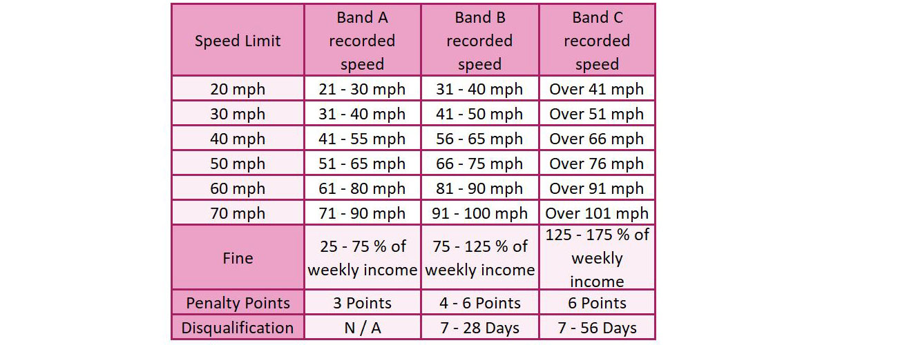 For more serious speeding offences you might get a court summons, and you can also decide not to accept a fixed penalty and take your case to court. In the event that you end up in court then the magistrate will have to follow sentencing guidelines which are divided into 3 bands: