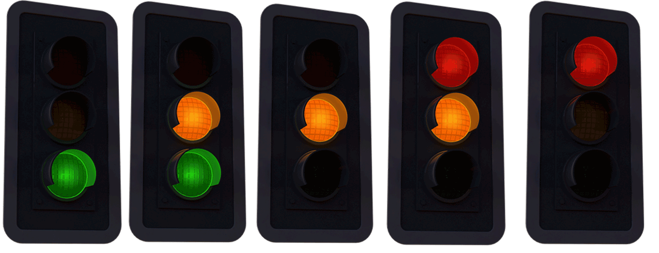 In the UK most traffic lights have a red, amber and green. You must slow down and stop when it's an amber light unless it's unsafe to do so and come to a complete stop when it's a red one. Sometimes, an amber light will show alongside a green or red light to indicate that it's changing, as pictured above.