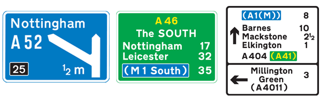 Rectangular signs give you information. On motorways these signs will be blue, on primary roads they’ll be green and on minor roads they'll be white. Rectangular signs are also used to indicate bus lanes, cycle lanes or areas where restrictions are in place, for example, congestion charge zones.