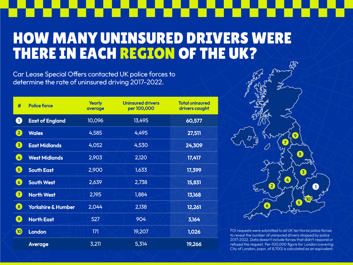 The 5 UK regions with the highest number of uninsured drivers (East of England, Wales, East Midlands, West Midlands and South East) are in the bottom half of the UK. In total, these regions alone have 147,213 uninsured drivers and an average rate of 5,255 uninsured drivers for every 100,000 of the driving population – more than 1 in 20.